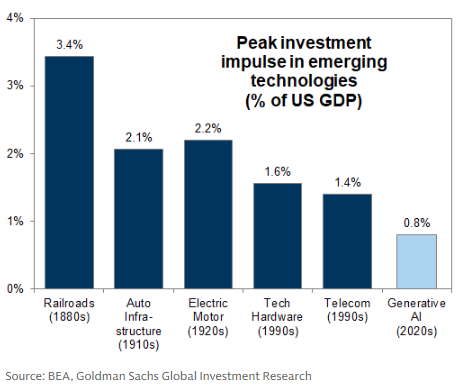 This may be a science and infrastructure initiative on scale with the Transcontinental Railroad, Manhattan Project or Apollo Missions, but those examples operated at significantly larger portions of GDP than our Pre-Genesis spend on AI according to Goldman Sachs. Will AI spend reach the level it took to build the railroads?