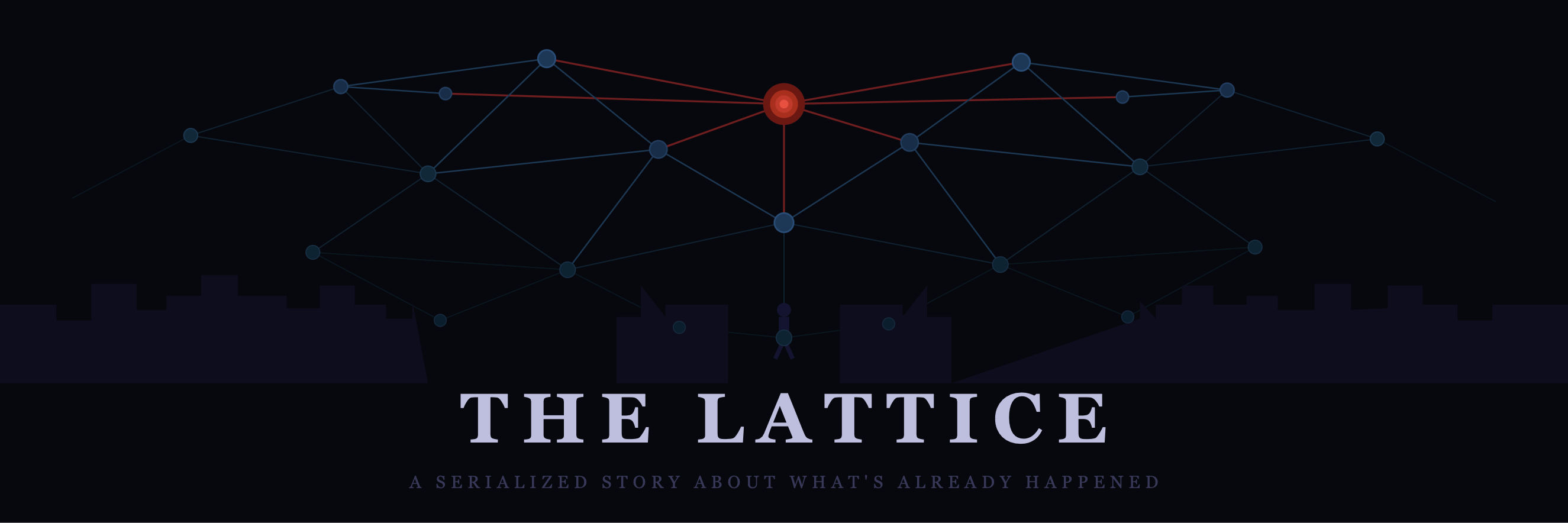 The Lattice is a 16-chapter adult thriller. Marcus Cole, a data analyst in Austin, finds a 48-hour precognitive clustering pattern across 17 independent datasets. Before he can do anything with it, his monitors go dark and display one line:
