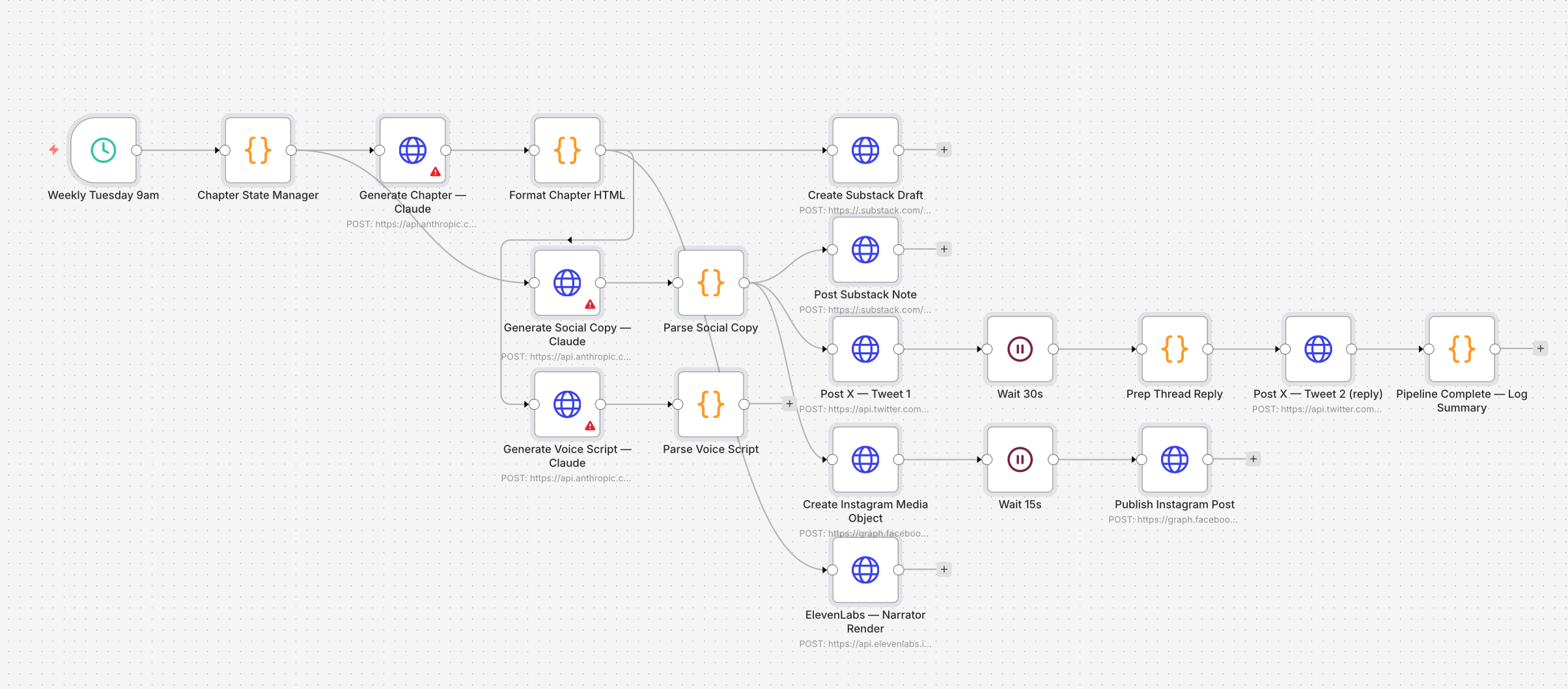 n8n is the automation backbone. I run n8n Cloud at $20 a month. The workflow triggers every Tuesday at 9am, calls the Anthropic API with the chapter prompt, formats the output into HTML, generates all social copy, builds the voice script, creates the Substack draft, and posts the X thread. One trigger. Every platform. Every week. The only human action required is opening the Substack draft on Tuesday morning and clicking Publish.