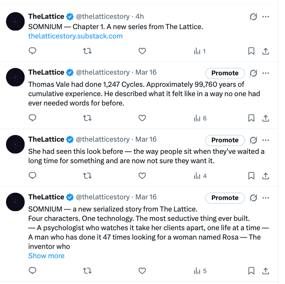 Serialized fiction is underserved on Substack. The platform is full of newsletters. It is not full of good serialized fiction. The Lattice Chapter 1 hit the platform and immediately generated more engagement than most of my business content. People are hungry for story. The form fits the medium perfectly — weekly drops, cliffhanger endings, a subscriber relationship that feels like following a show.